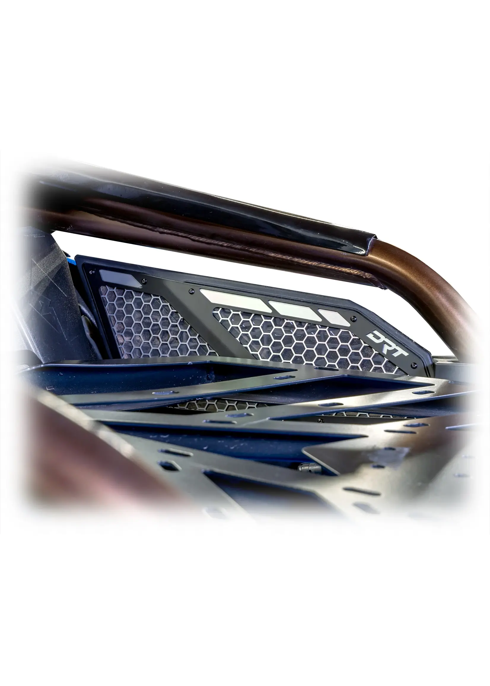 This complete set (P/N 20005IV04101) includes both inner and outer protection for the intake and clutch vents on your Pro Series RZR. This multilayer laser cut intake vent cover set includes a top frame finished in black powder coat and a contrasting bright anodized mesh back plate.