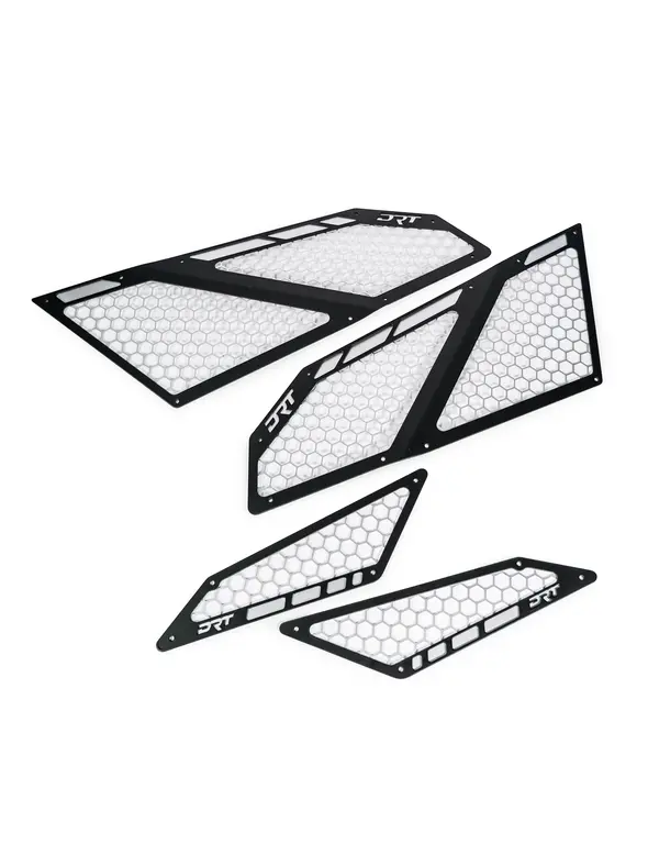 The outer set features an outer frame with premium DRT branding and an inner laser cut panel with contrast panels that let the bright anodized finish come through. The outer kit is available on its own under (P/N 20005IV06101). The inner kit features 4 aluminum mesh plates for each pocketed area of the inner intake vents, and a single-formed top frame to cover both mesh joining both inner panels. Removal of OEM deflectors P/N 5457037 & 5457038 is required on Pro R and Turbo R models to use the inner kit.