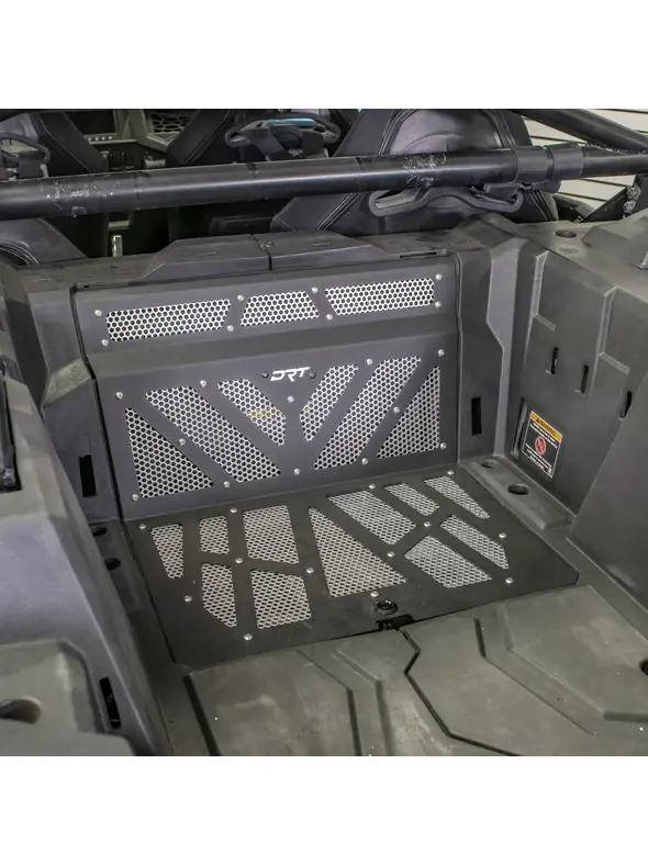 The DRT Motorsports RZR XP 1000 and XP Turbo vented engine cover is the perfect solution to keeping your RZR cooler and reducing weight. The DRT RZRXPEV1 vented engine cover is a direct replacement for your factory plastic engine cover. In addition to helping keep your RZR XP 1000 or XP Turbo cooler, the DRT engine cover looks awesome and is very durable. The vented engine cover comes with a full adjustable push-button release to keep engine access easy and quick when you are on the trail or in the shop. The DRT vented engine cover comes in a power-coated black finish with raw aluminum vents.